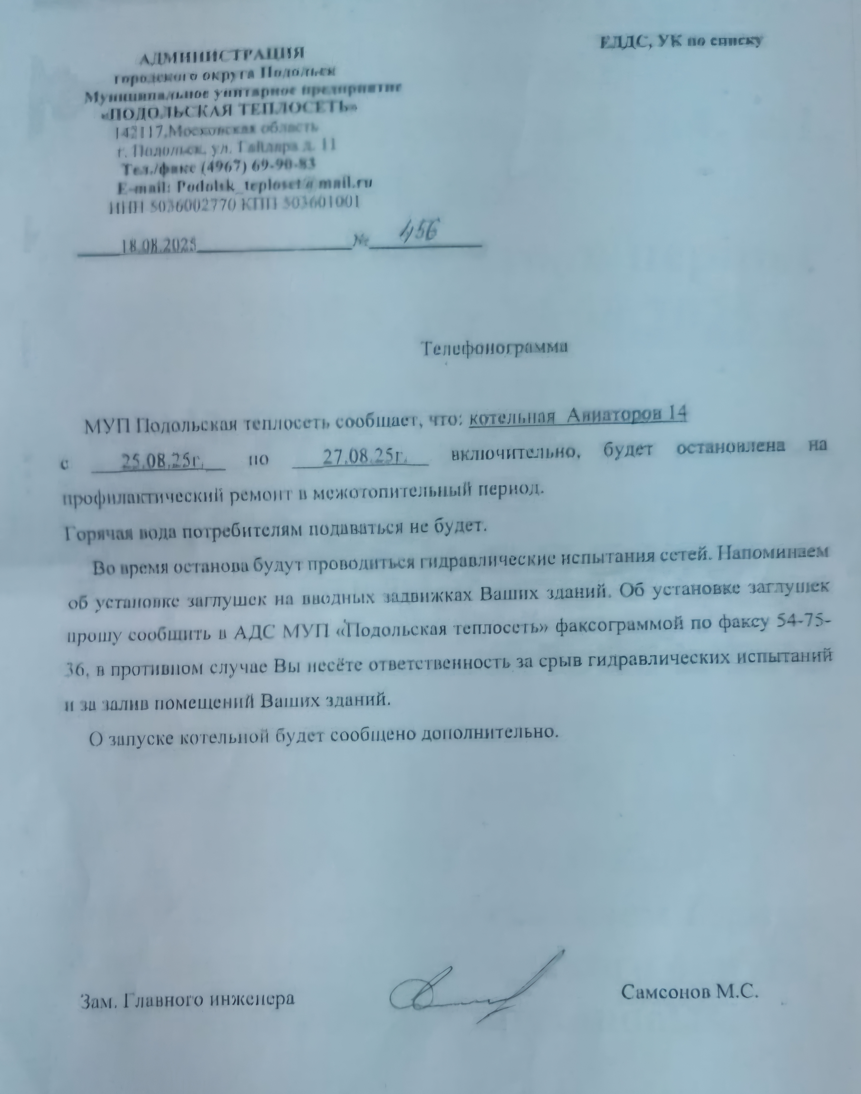 МУП Подольская теплосеть сообщает, что: котельная Авиаторов 14 с 25.08.25 г. по 27.08.25 г. включительно, будет остановлена на профилактический ремонт в межотопительный период.
