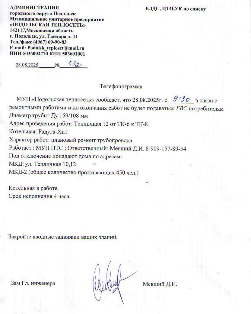 Для жителей МКД по адресу: Тепличная д.8 и 10 - отключение подачи ГВС