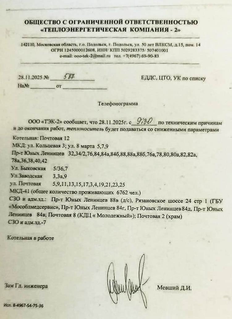 Для жителей МКД по адресу: Г.о. Подольск, г.Подольск, ул.Кольцевая, д. 3 - теплоноситель со сниженными параметрами