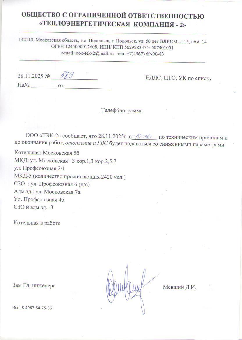 Для жителей МКД по адресу: Г.о. Подольск, г.Подольск, ул.Кольцевая, д. 3 - теплоноситель со сниженными параметрами