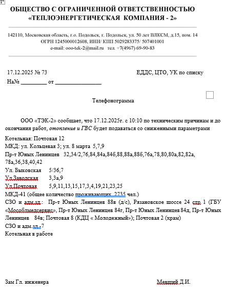 Для жителей МКД по адресу: ул.Кольцевая д3 - ГВС и отопление со сниженными параметрами
