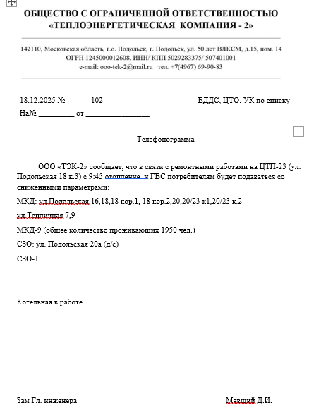 ООО «ТЭК-2» сообщает, что в связи с ремонтными работами на ЦТП-23 (ул. Подольская 18 к.3) с 9:45 отопление и ГВС потребителям будет подаваться со сниженными параметрами: