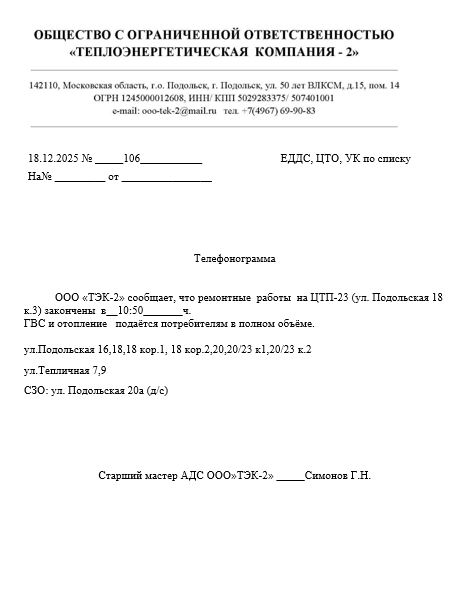 ООО «ТЭК-2» сообщает, что ремонтные работы на ЦТП-23 (ул. Подольская 18 к.3) закончены в__10:50_______ч.
